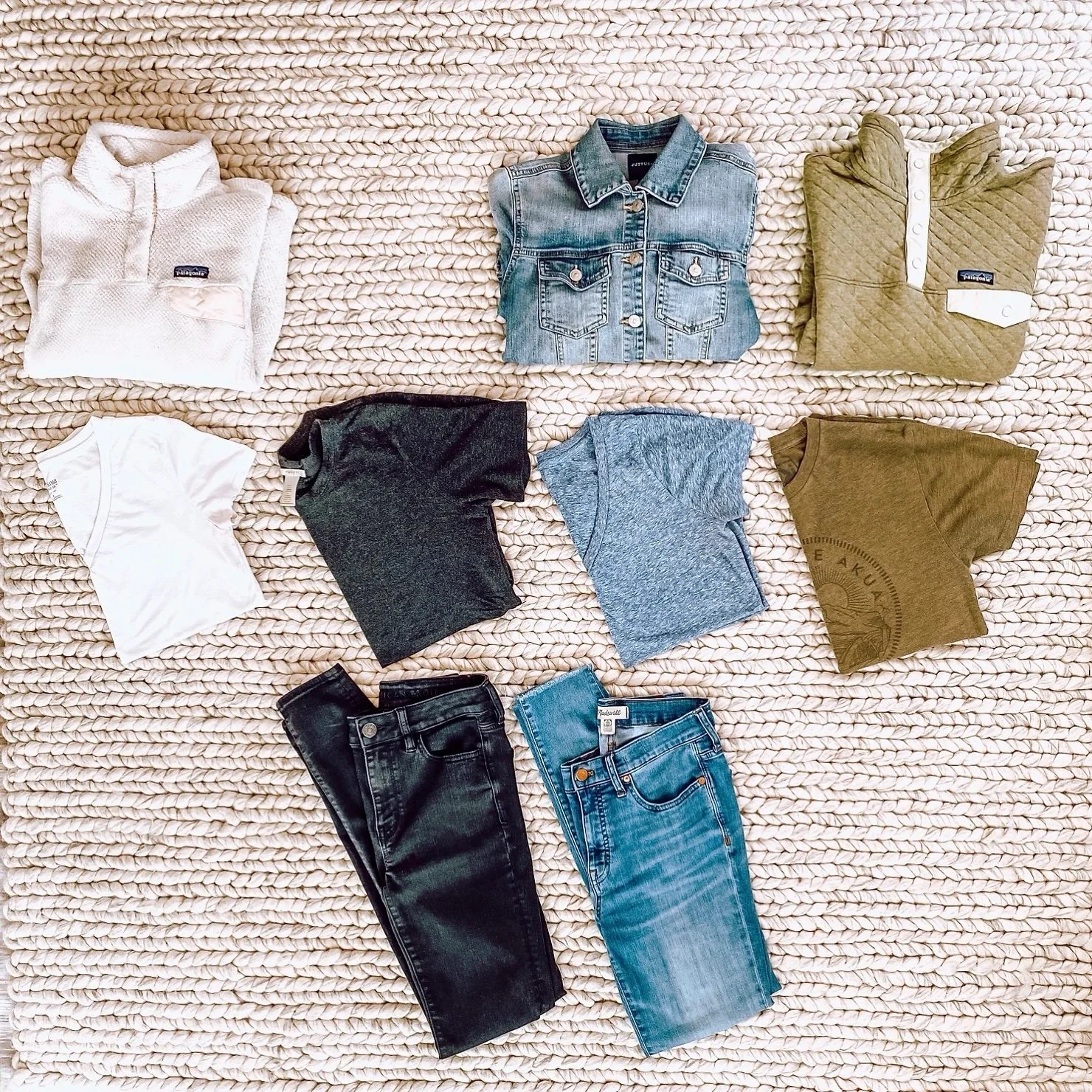 The picture above shows some of my core pieces. I think black and white are foundational colors, so I made sure to keep those. Next, I picked my favorite colors, the ones I love to wear. I chose green just because I like it, really no other reasoning there haha, but I chose blue because I wear denim a lot and I doubted I would stop wearing denim anytime soon. I was right! I still wear denim all the time.