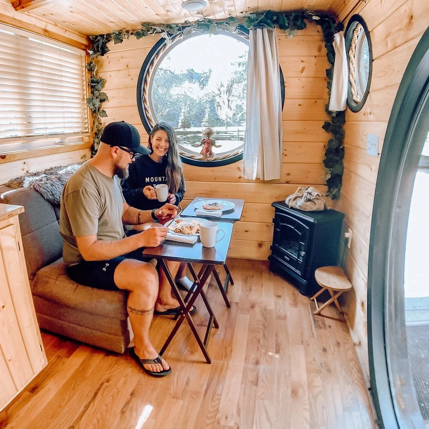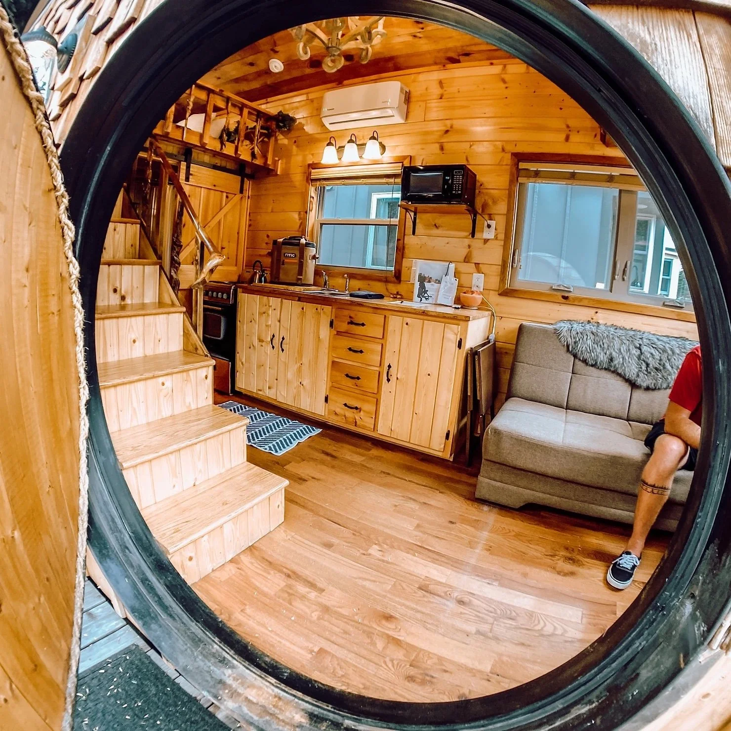 We stayed in the smallest home on-site, The Gnome Home, which is themed after Lord of the Rings and our favorite hobbit hero's house! Can you see the little Frodo plush sitting in the window? This tiny house has all the fantasy touched you would expect to find. Everything from magically twisted wood hand-rails to fairy lights in the vines strung around the cabin, this tiny house is full of whimsy. And who could miss the trademark round entrance!